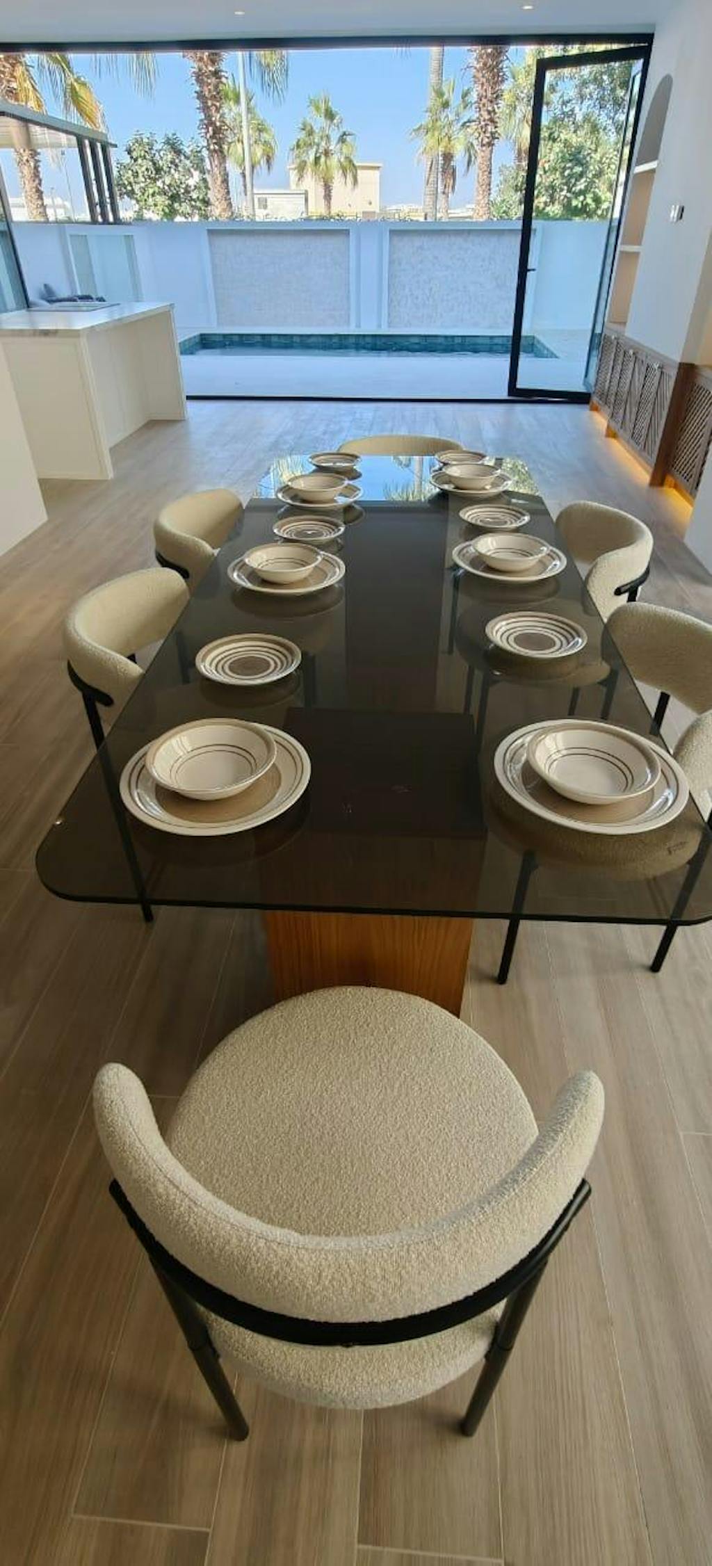 مُنجّد بقماش البوكليه الناعم: استمتع بالفخامة مع تنجيد قماش البوكليه الناعم والأنيق، مما يضيف لمسة من الرقي إلى منطقة تناول الطعام الخاصة بك.
