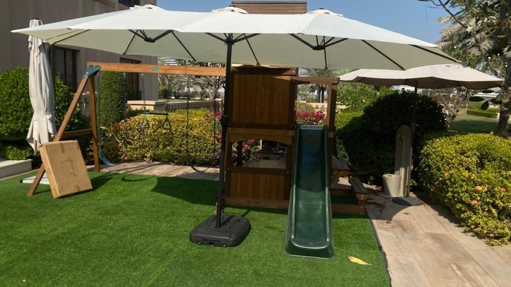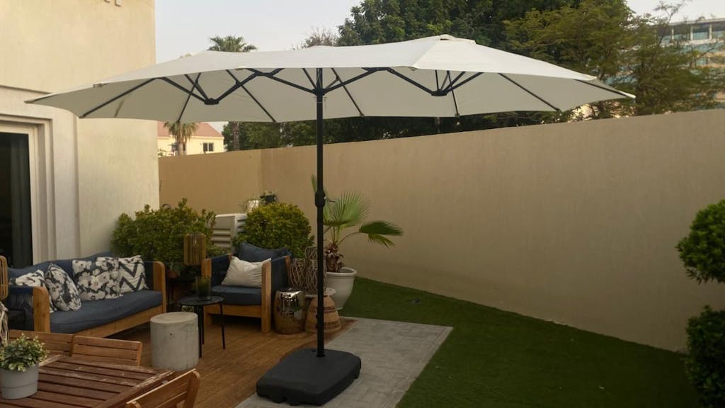 We bought this 15‑ft double-sided umbrella for our garden and it’s been a game‑changer. The canopy covers a large seating/dining area — easily fits 6–8 people under it, great for afternoon tea or evening get‑togethers. The crank‑lift system works smoothly — opening and closing the umbrella is effortless and doesn’t need much strength. The polyester canopy feels thick and the water‑resistant fabric held up well during light monsoon showers. On sunny summer afternoons, the UV‑protected fabric kept the heat and harsh sunlight off — we could enjoy the outdoors comfortably. Overall — looks good, works well, and is extremely useful if you have a big patio or outdoor space.