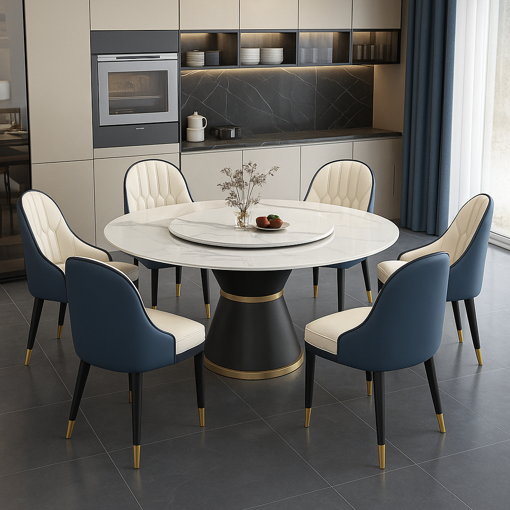 قم بترقية تجربة تناول الطعام الخاصة بك مع مجموعة طاولة الطعام المستديرة الحديثة الملتوية الخشبية. تم تصميم هذه المجموعة المكونة من 6 مقاعد مع وضع الأناقة والوظائف في الاعتبار، وتتميز بدوارة من ألواح الصخور وزوايا مدورة مصقولة وطاولة من ألواح الصخور. تضمن القاعدة الحاملة للحمل المصنوعة من الفولاذ الكربوني الثبات، بينما يضيف غطاء القدم الذهبي اللون للكرسي لمسة من الرقي.