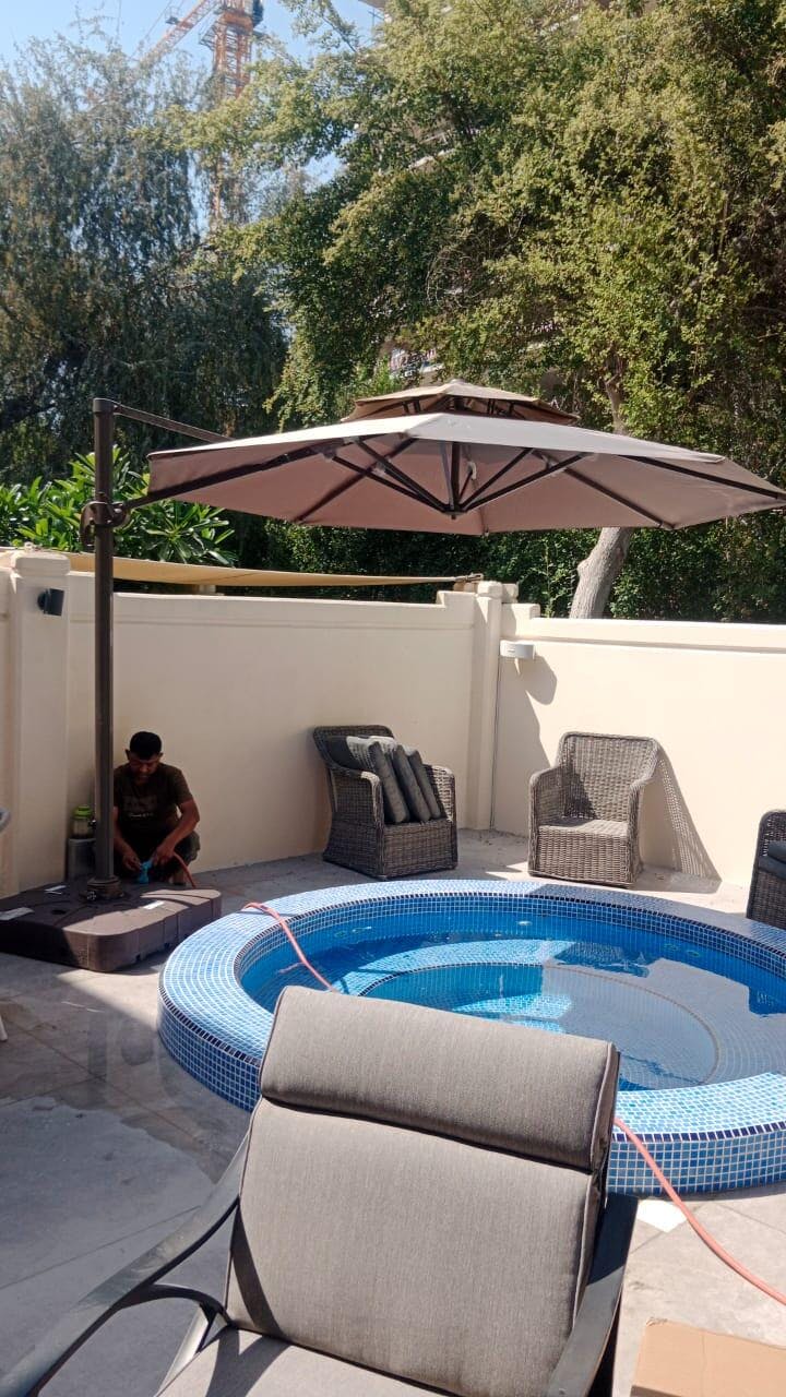 Overall, a very stylish and functional umbrella. The aluminium frame and water base make it quite sturdy, and it doesn't tip over easily. The rotating handle is very convenient. My only issue was that the wooden twist part had a minor scratch on arrival, but customer service was quick to resolve it.