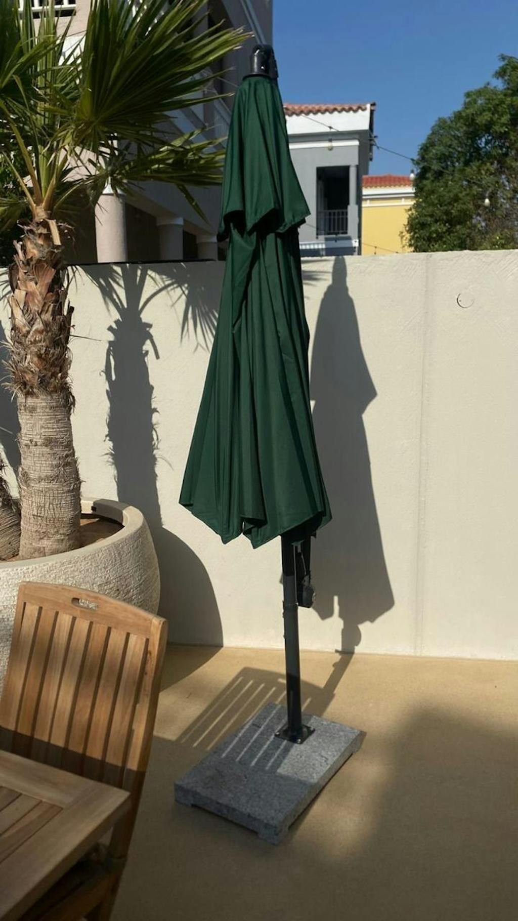 The umbrella gives a luxury outdoor café feel. Strong frame, easy rotation, and great shade.
