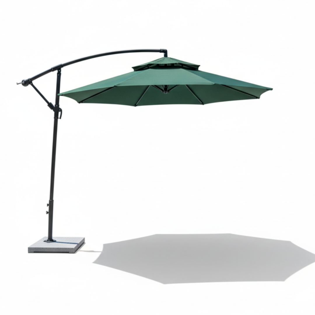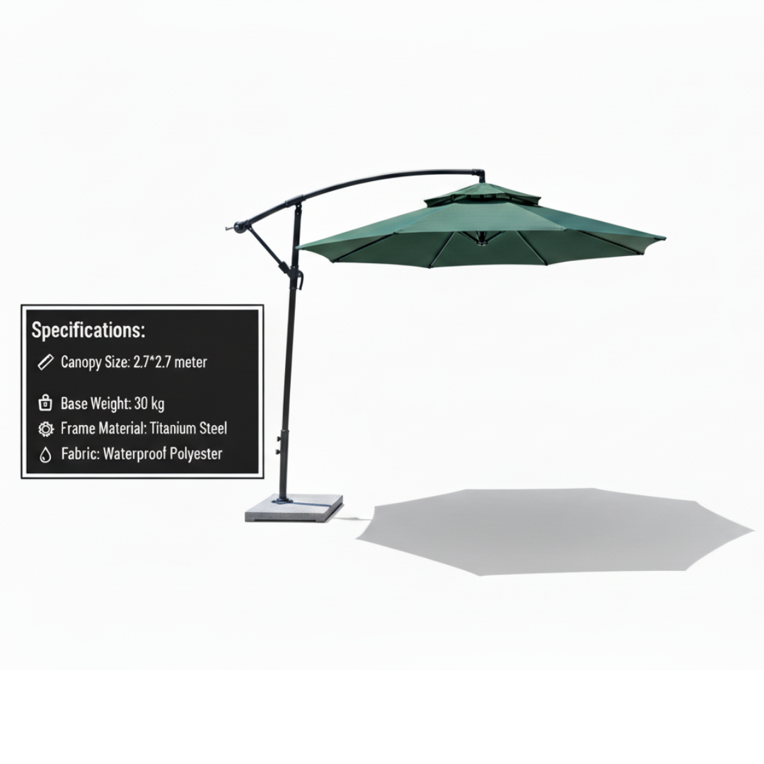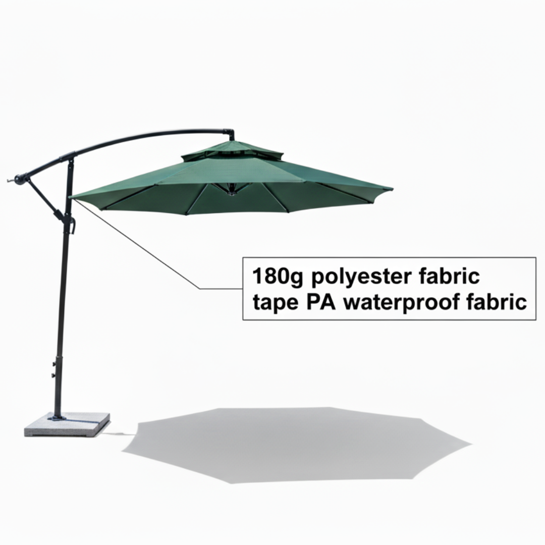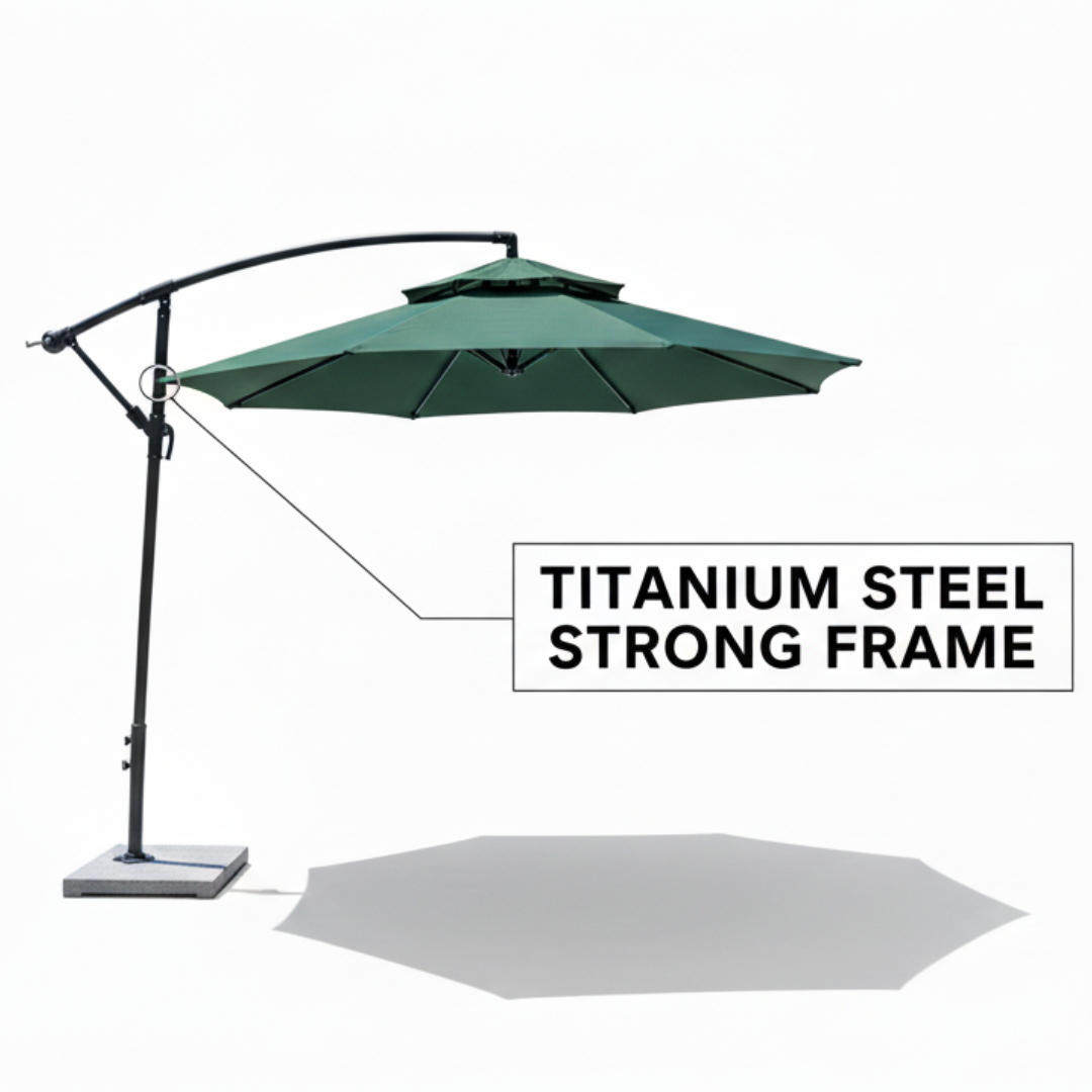 Crafted from premium polyester fabric with PA waterproof coating, it ensures UV protection and weather resistance, keeping you cool and safe during sunny or rainy days. The titanium steel frame offers unmatched strength and stability, while the cantilever offset design allows flexible positioning without a central pole blocking your space.